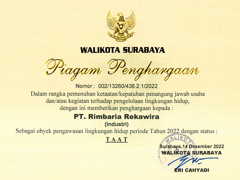 Dalam rangka pemenuhan ketaatan penanggung jawab usaha terhadap pengelolaan lingkungan hidup, PT Rimbaria mendapatkan piagam penghargaan dari Bapak Eri Cahyadi selaku Walikota Surabaya sebagai obyek pengawasan lingkungan hidup periode 2022 dengan status TAAT.